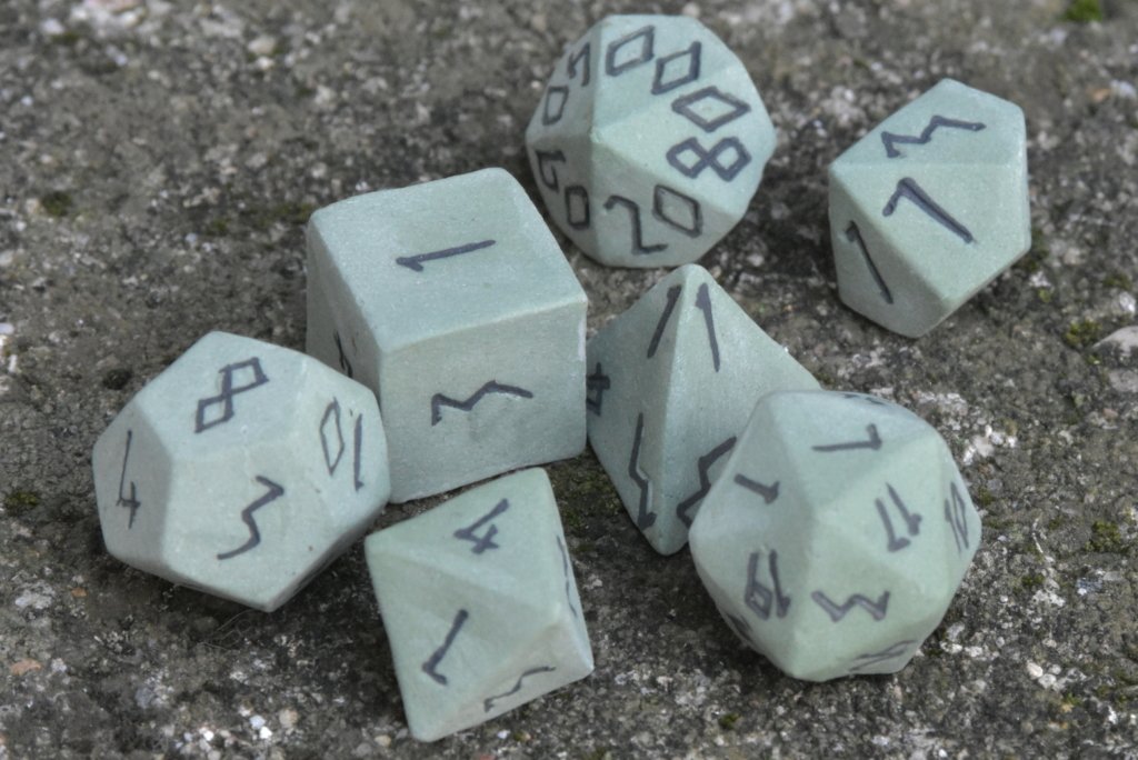 Every dice in this set is a work of art. Crafted from ceramic and designed in the muted green shades of an unattended forest, these dice evoke a sense of mystery and enchantment. Each die features intricate black runic inscriptions, mirroring ancient scripts used by sorcerers and druids. Moreover, the surface texture subtly resembles natural stone, adding an earthy touch to each piece.